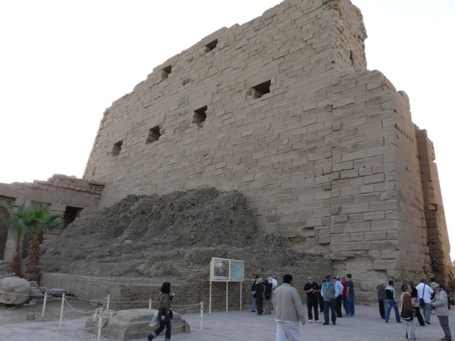 La utilización de rampas para la construcción de pirámides (por ejemplo la de Sinki al sur de Abidos, la de Sejemjet en Sakkara, las de Sesostris I y Amenemhat III en Lisht, la de Maidum,…) y templos (como por ejemplo el de Karnat) queda demostrada por los restos encontrados en Egipto. Los restos están ahí y todos los turistas ocasionales podemos verlas y reconocerlas sin haber estudiado Arquitectura. Estas rampas estaban formadas por dos muros de roca que se rellenaban con piedras y tierra (la rampa del templo de Karnat es de adobe pero se rellenaba de forma similar).