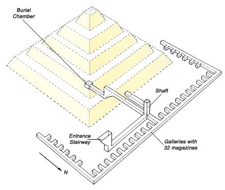 funeraria y está excabada bajo la base de la misma pirámide junto con sus pasajes.