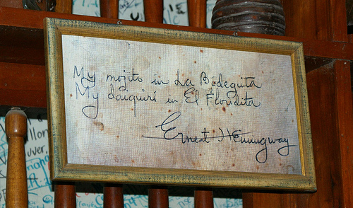 El salto definitivo a la fama de esta bebida que ya empezaba a conocerse como ‘Mojito‘ (nombre cubano para los aliños hechos con lima) vino de la mano de un afamado cuentista del siglo XX llamado Ernest Hemingway, habitual consumidor (más bien diario consumidor) en ‘La Bodeguita del Medio’, un lugar emblemático de la vieja Habana, lleno de historias donde personajes como Errol Flynn, Salvador Allende, Ava Gadner, Pablo Neruda, Nat king Cole, Mohammed Ali, Gabriel García Márquez etc… dejaron su firma en las paredes a su paso.