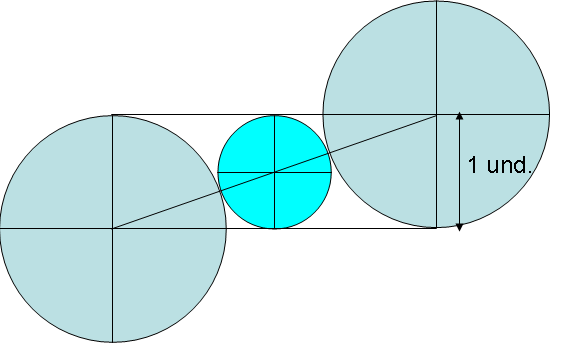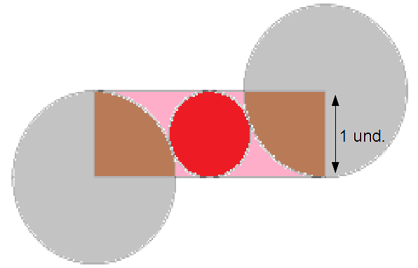 3 unidades. 1 radio (1 unidad) + 1 radio (1 unidad) + 2 radios o 1 diametro (1 unidad). El diametro de la circunferencia pequeña mide igual que el radio de las circunferencias grandes para que los lados del rectángulo puedan ser horizontales.