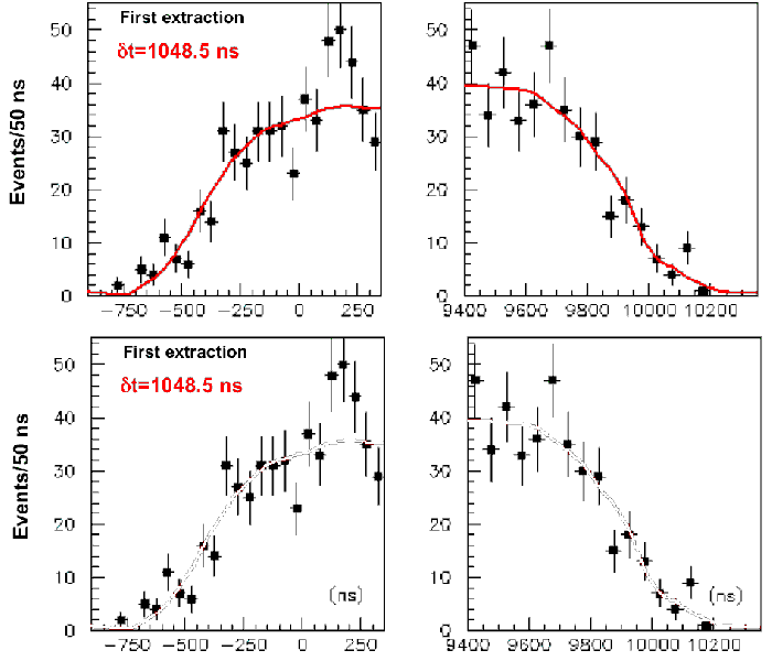 Según otras opiniones, la fuente del error puede estar en el ajuste del frente de los trenes de protones y de neutrinos. En óptica no lineal, cuando se observa la propagación superlumínica de señales siempre es debido a este problema, definir correctamente cuando ha llegado el tren de fotones (paquete de ondas) debido a que su forma no coincide con el tren emitido y utilizar el mismo criterio en ambos no está justificado. Para los aficionados al deporte quizás ayude saber que este problema es el mismo que el de la foto finish. Se supone que el instante de llegada del corredor es cuando su pecho supera la línea de meta, pero que pasa si el atleta torsiona su cintura al llegar y lo que se observa en la foto finish es la llegada del hombro; o si estira el brazo y lo que llega primero a meta es la parte del pecho cercana al cuello; o que si pasa si hay atletas más altos y más bajos; cuándo llegó el centro del pecho a cruzar la línea es un problema que requiere el criterio de los jueces de la competición y este criterio puede variar de un juez a otro. La forma del frente del tren de protones (donde se inicia la cuenta de tiempos en el CERN) se utiliza como referencia (línea roja) y se ajusta a la forma del frente del tren de neutrinos (donde finaliza la cuenta de tiempos en Gran Sasso). Obviamente, los científicos de OPERA han considerado esta posibilidad en detalle, pero en este tipo de experimentos la duda siempre surge. Abajo se muestra la figura original de los frentes y la misma figura con la línea roja en blanco, ¿por dónde dirías que debería pasar la línea roja? Por cierto, la incertidumbre horizontal de los puntos es de unos 50 ns y se ha medido una diferencia de tiempos de solo 60 ns. ¡Hay poco más que decir!.