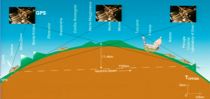 Para medir la velocidad de los neutrinos, los científicos de OPERA miden el tiempo que éstos demoran en viajar los 732 km que separan, en una línea recta por el interior de la corteza terrestre, a la fuente de emisión -en el CERN, en la frontera franco-suiza- del detector, bajo la dura roca del Gran Sasso. De acuerdo a los investigadores del proyecto, la distancia ha sido medida con un error menor a los 20 cm, utilizando la más moderna tecnología GPS.