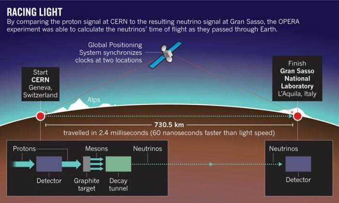 Los científicos de OPERA lo que han hecho es medir el tiempo que tardan los neutrinos en recorrer la distancia entre el punto de partida en el CERN y el detector en Italia recurriendo a relojes atómicos sincronizados y sistemas avanzados de GPS, teniendo incluso en cuenta movimientos geológicos, y compararlo con el tiempo que tardaría la luz en recorrer esa misma distancia de 731 kilómetros a su velocidad constante de 300.000 kilómetros por segundo en el vacío. Según sus resultados, los neutrinos tardan 60 nanosegundos menos de lo que tardaría la luz.