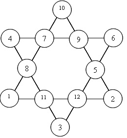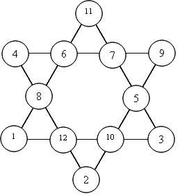 Rellenar el sello de Salomón con los números de 1 al 12 de forma que todos sus lados sumen 26, es relativamente fácil.