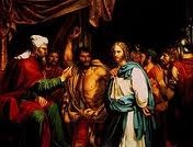 Éste es el hombre al que va a enfrentarse Jesús, exhausto tras una noche de interrogatorios, golpes y torturas. La policía del Templo y los emisarios del sumo sacerdote lo han conducido hasta el pretorio, lugar en el que el pretor (magistrado cuyas funciones son desempeñadas, durante el Imperio, por el gobernador de la provincia) pronuncia sus fallos y que con frecuencia corresponde a su residencia. Los judíos no quieren entrar, por temor a mancharse, ya que, a sus ojos, una residencia «pagana» es un lugar impuro, y se acerca la Pascua. Por lo tanto, es el romano el que sale, el que va a su encuentro, enojado sin duda por la molestia. Su corta vestimenta de cuero y los botines le dejan las piernas al aire, y se ha echado una esclavina sobre los hombros. Los escucha. Ellos acusan a Jesús, como estaba previsto, de pretender ser rey de los judíos y agregan, a mayor abundamiento, que predica la subversión e impide a los buenos ciudadanos pagar el tributo.