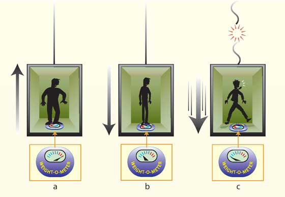 Consideremos la situación siguiente. Si te subes en una balanza de baño dentro de un ascensor que está acelerando hacia arriba, tus pies ejercen una gran presión sobre la balanza, que regristrará un peso mayor del real (arriba, a). Lo mismo sucedería, sin embargo, en un ascensor estático si la gravedad se hiciera más fuerte por algún motivo. Y un ascensor acelerando hacia abajo produciría la misma sensación que una gravedad más débil (arriba, b). Si el cable del ascensor se partiera, tú y la balanza caerías a la vez, en caida libre; y la balanza registaría peso cero (arriba, c). Así pues, la caída libre equivale a que alguien milagrosamente hiciera desaparecer la gravedad. Esto es lo que llevó a Einstein en 1.907 a una realmente rompedora conclusión: la fuerza de la gravedad y la fuerza resultante de la aceleración son de hecho una y la misma. Esta potente unificación ha recibido el nombre de «principio de equivalencia» e implica que la aceleración y la gravedad son realmente dos facetas de una misma fuerza: son equivalentes.