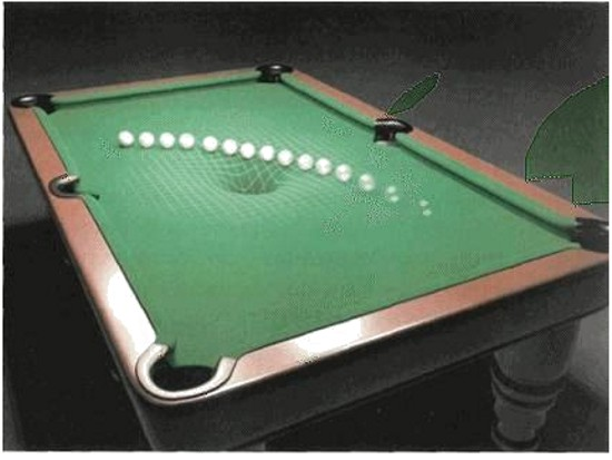 espacio-tiempo. Veamos este punto con más detalle visualizando una mesa de billar. Si la mesa tiene un bache en el centro, suavemente hundido con respecto al plano horizontal, cuando una bola pase por esa zona su trayectoria se desviaría. Incluso, si el bache es suficientemente profundo y amplio y la velocidad de la bola de billar suficientemente pequeña, puede que la bola quede atrapada por el bache cayendo hacia su centro describiendo una trayectoria espiral.