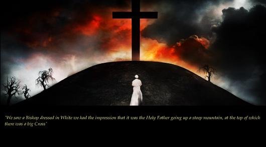 Un obispo vestido de blanco, «nos pareció el Santo Padre», otros obispos, religiosos y religiosas subiendo una montaña escarpada, en cuya cima se alzaba una gran cruz de troncos irregulares que parecían de alcornoque por la corteza. Antes de llegar allí, el Santo Padre atravesó una gran ciudad medio en ruinas, un tanto tembloroso y con paso titubeante, afligido de dolor y pesar. Rezó por las almas de los cuerpos que se fue encontrando por el camino. Una vez coronada la cima de la montaña, de rodillas a los pies de la gran cruz, un grupo de soldados le disparó balas y flechas y lo mató, y de esa misma forma murieron, uno tras otro, los demás obispos, religiosos y religiosas y diversos seglares de distinta categoría y condición. Debajo de los dos brazos de la cruz había dos ángeles con sendos aspersorios en los que reunieron la sangre de los mártires y con los cuales asperjaron las almas que se encaminaban a Dios.